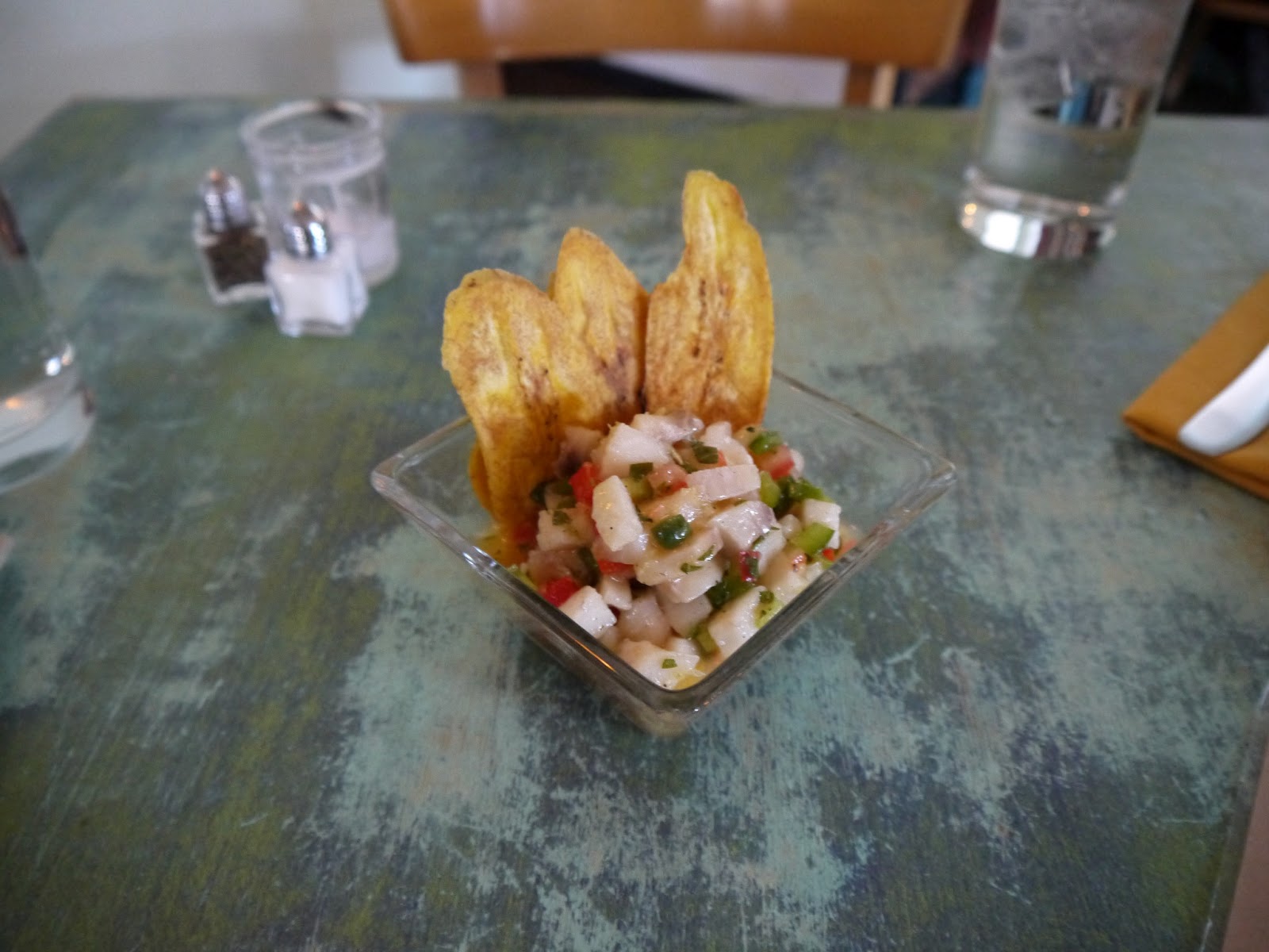 We started out with the ceviche, which is fish and lots of veggies in a soupy substance called tiger’s blood. Instead of eating it off forks, which I usually do when it comes to ceviche, we ate with plantain chips.