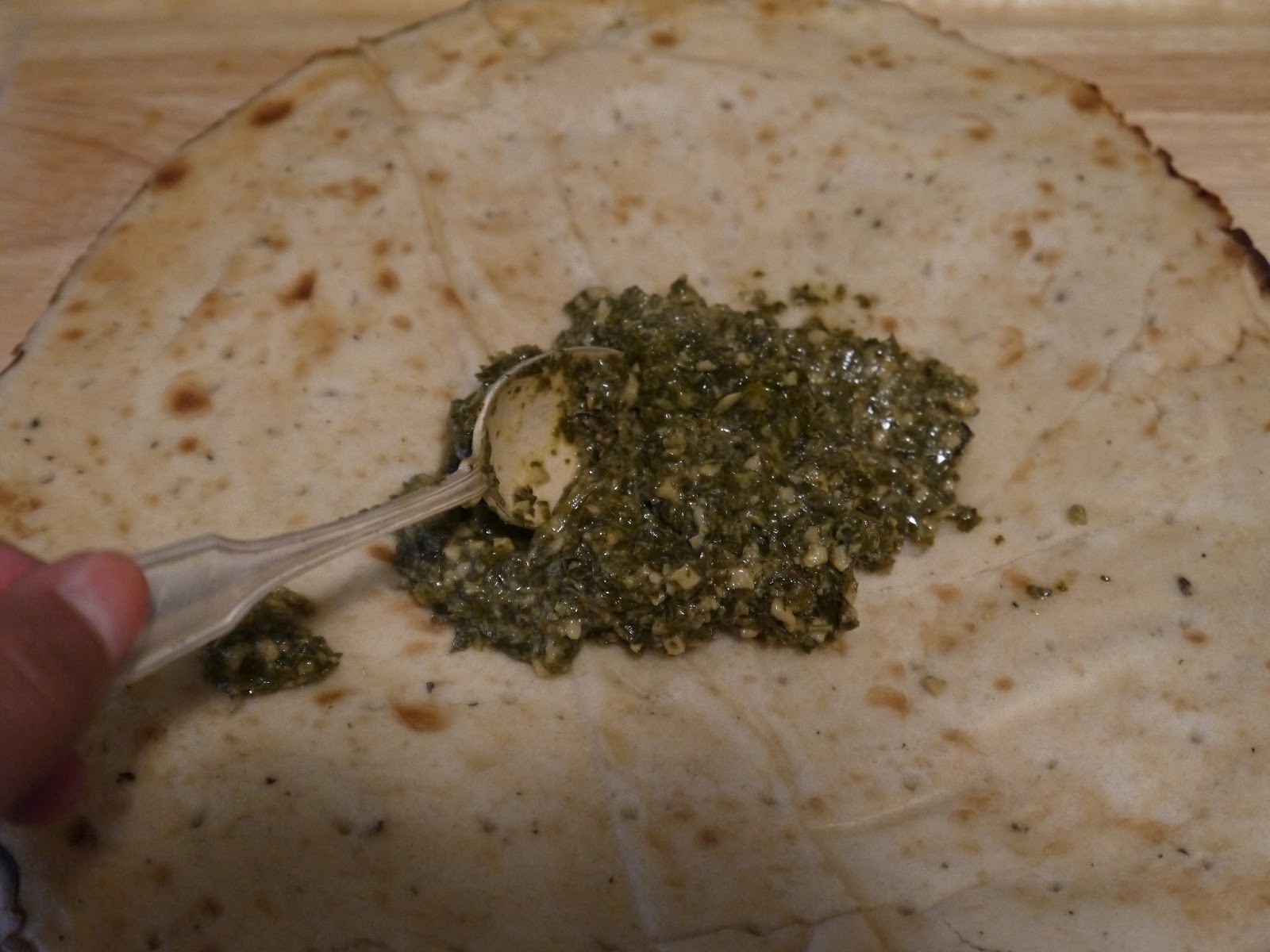 Lay crust out on pizza stone, or on clean counter top. Spread the pesto