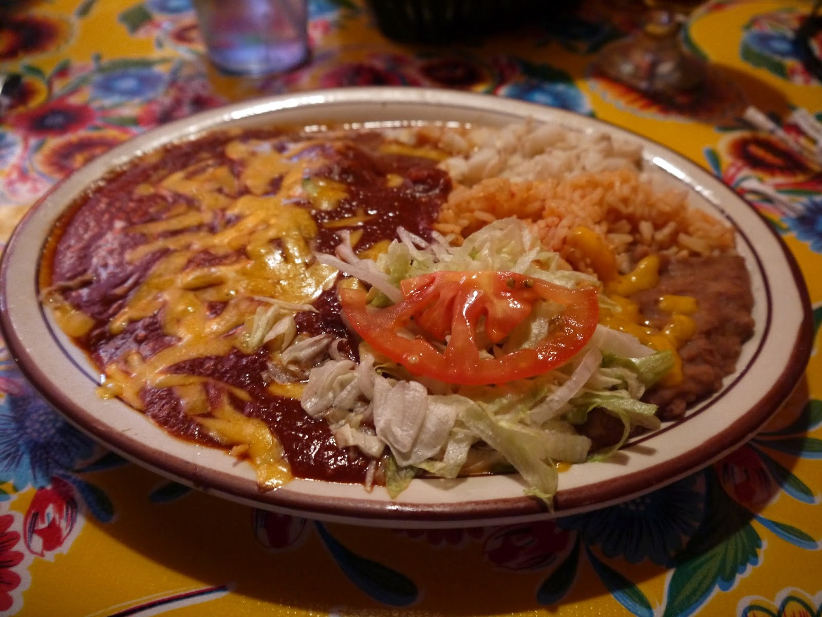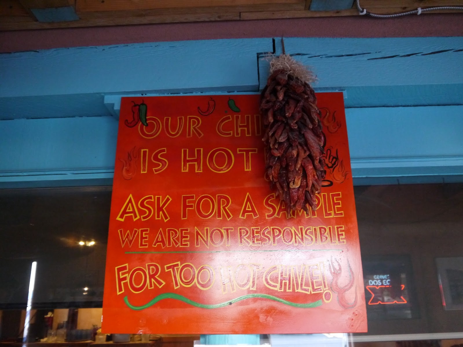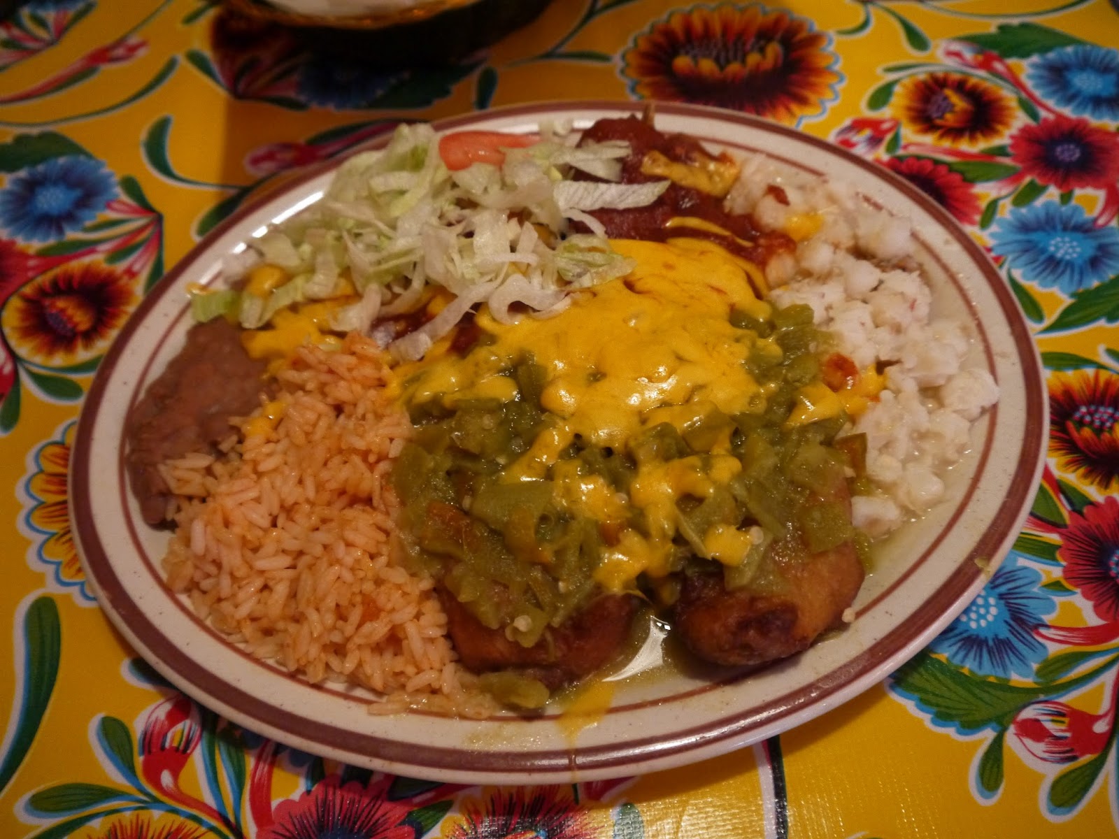 I had an Agave Wine Margarita (seen here with a Sangria) to kick things off, and a Chile Relleno (if you’re not familiar with that, it’s a deep fried cheese stuffed pepper- yes, I can feel my arteries hardening as I type!) with red and green chile for my main course.