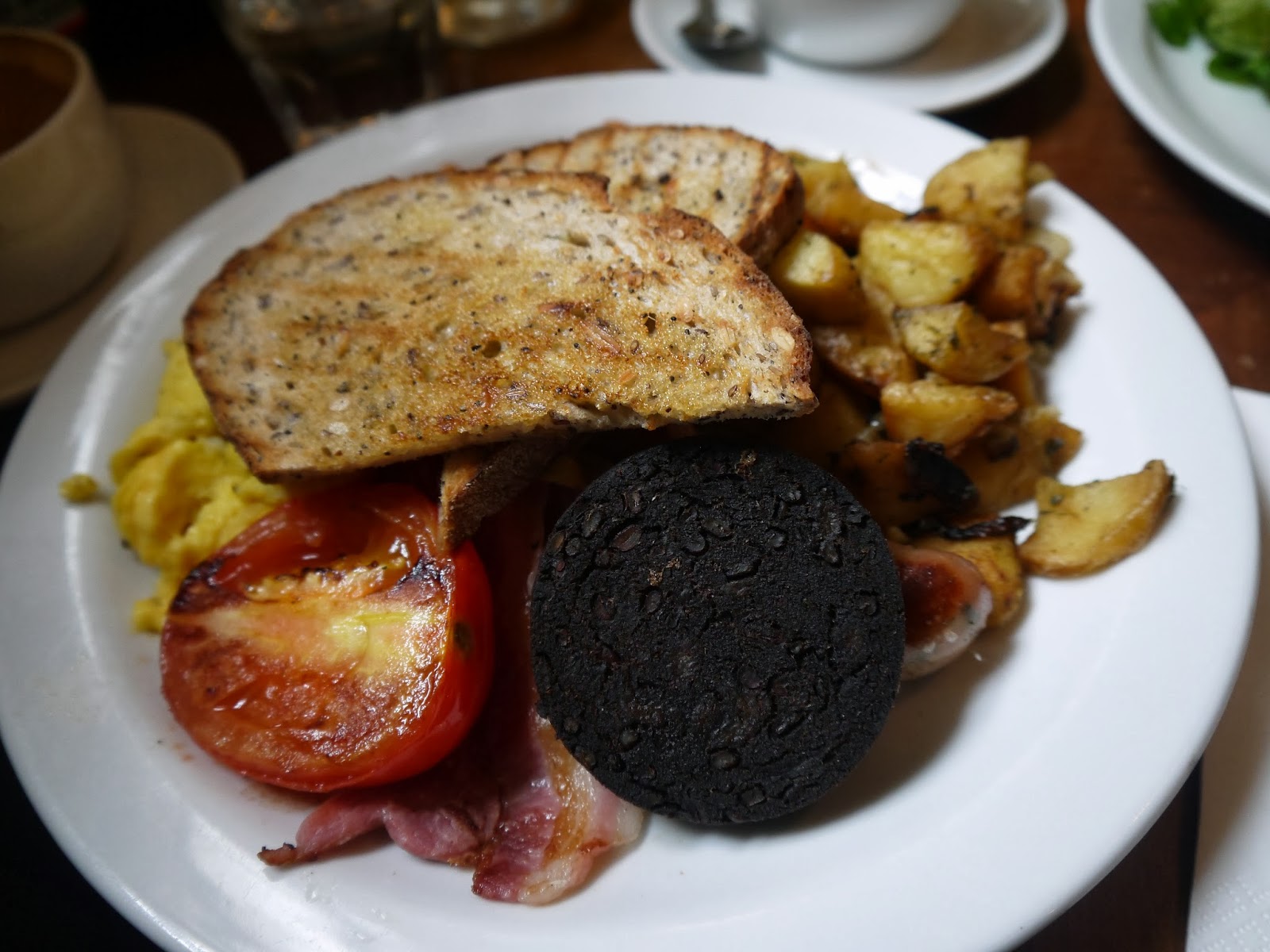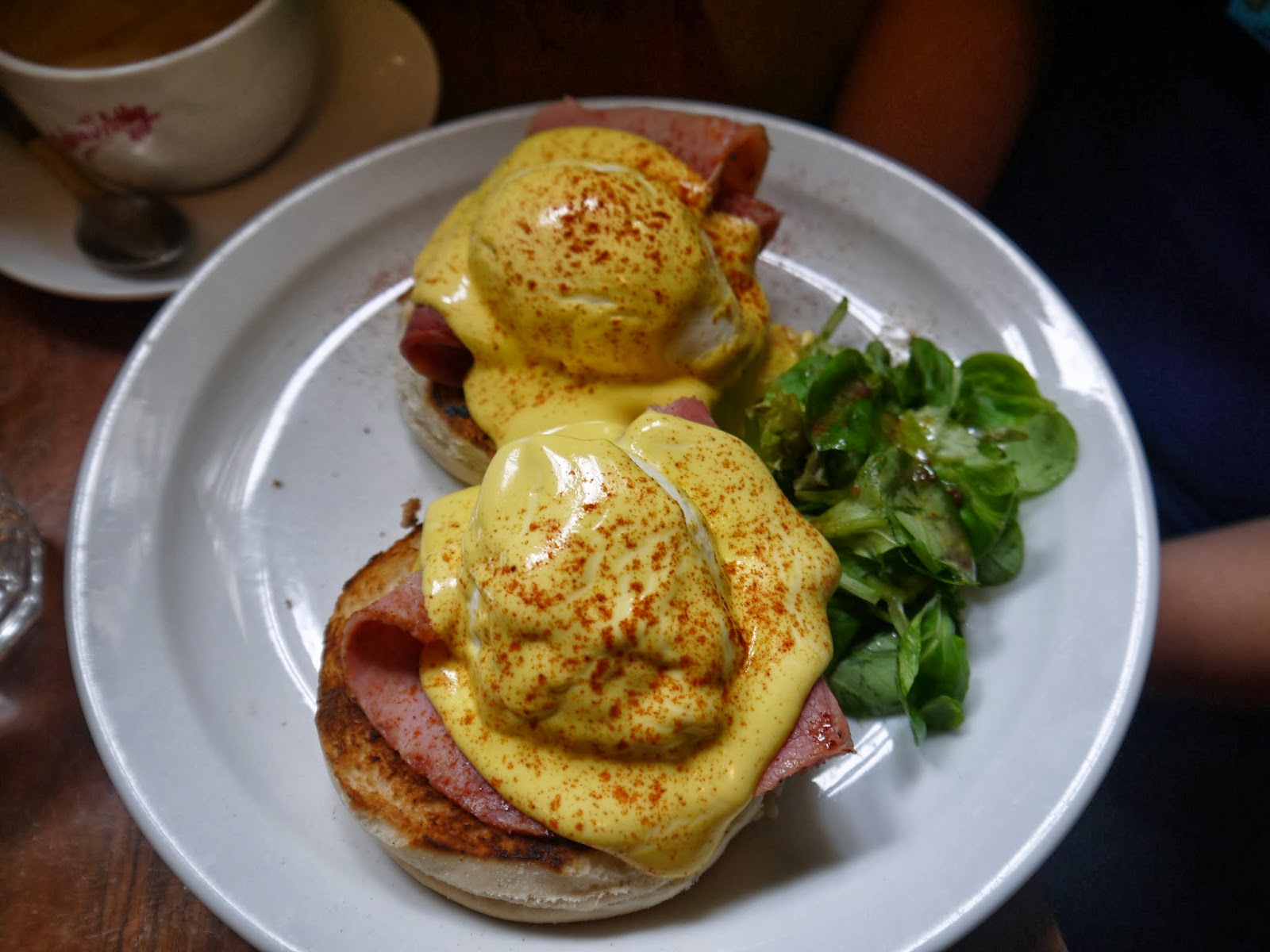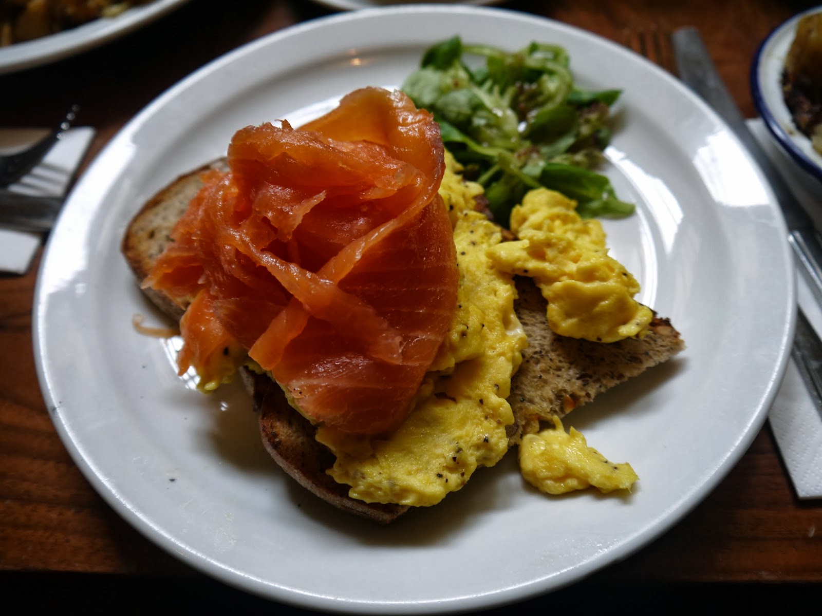 In the end, I had salmon with eggs (alas- no pancakes this time), HBL had a proper English fry up (which upset me, considering the big blood pudding on his plate) and V had poached eggs.