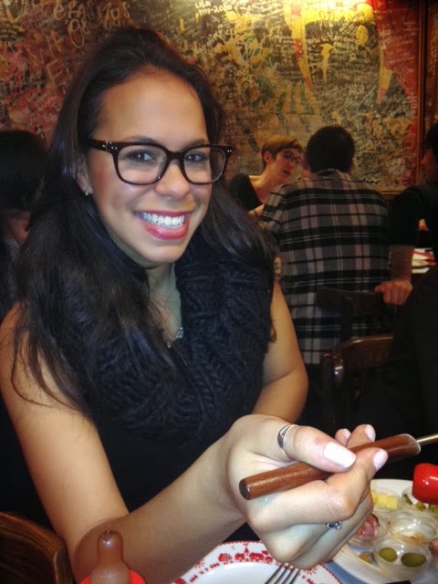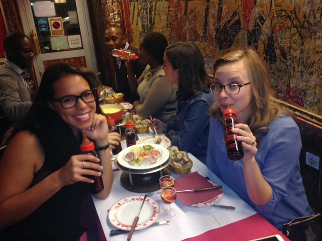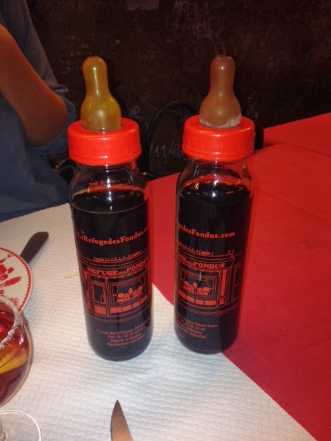 | A. and I at Les Refuges des Fondues, a great place to try fondue and wine- in baby bottles! |