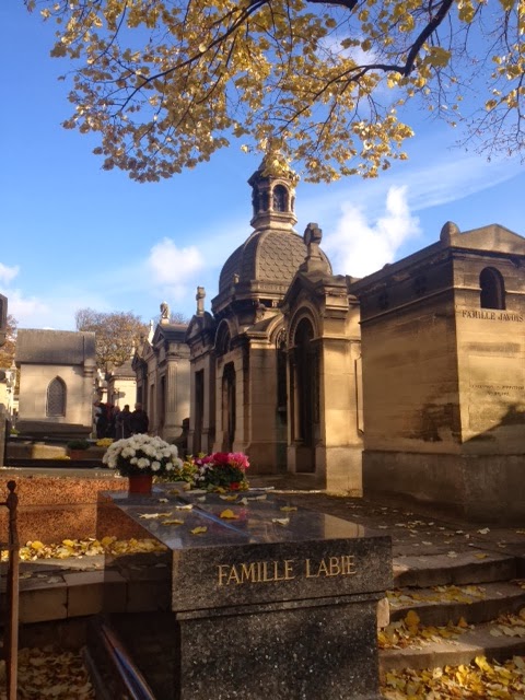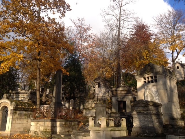 After dropping our stuff off at Hotel Fabric, our fabulous abode in the Oberkampf neighborhood (which is central enough to everything to be convenient, but out of the hubub of the Marais or Montmarte areas, which are quite loud 24/7, in my experience) we started our tour at Pere Lachaise. I love old cemeteries, especially European ones, which are more like crowded little cities with narrow lanes and, in the fall, delightfully colorful trees.
