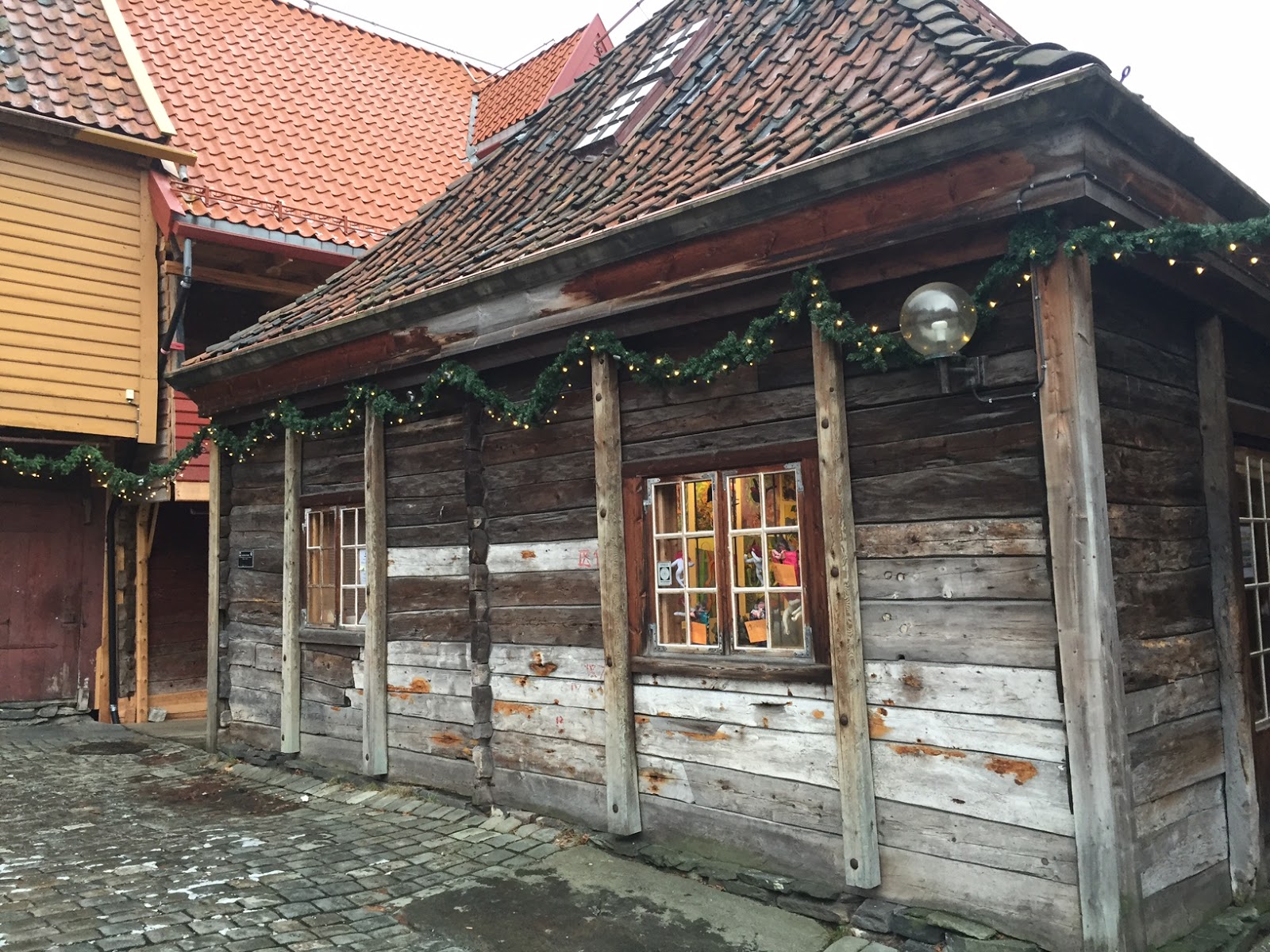 Behind the shops in Bryggen is a maze of wooden shops that must be at least 300 years old. It was fun to walk through them, although they look precariously old and are definitely leaning at obtuse and somewhat precarious angles.